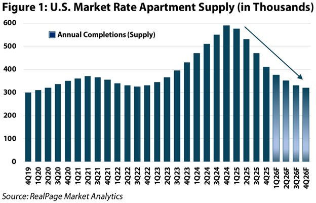 Our team met with AvalonBay Communities (NYSE: AVB), Independence Realty Trust (NYSE: IRT), UDR Inc. (NYSE: UDR), and attended a well-organized property tour with Mid-America Apartments (NYSE: MAA). Across these discussions, our view that 2026 is likely to remain a transition year was reinforced. With supply pressure fading (Figure 1), affordability favoring renting, and year-over-year comparisons easing, the slope of the rental recovery story continues to slowly improve.