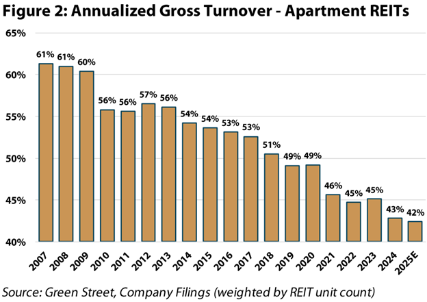 On internal initiatives, management teams emphasized centralized staffing models to drive efficiencies, value-add resident services to generate incremental income, and accelerating use of AI to automate key tasks. As for renter demand, the elevated cost to own has pushed apartment turnover near all-time lows (Figure 2), keeping occupancy high (~96%) and leading way to concessions, or apartments offering one to two months of free rent, finally tapering off.