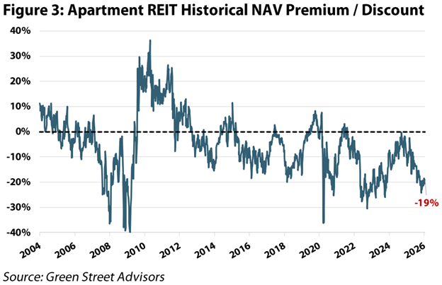 Overall, we remain equal-weight to the multifamily sector, balancing near-term supply headwinds and a slowdown in household formations against a steep valuation discount, with apartment REITs currently trading at a ~19% discount to net asset value (NAV) on a weighted basis (Figure 3). Whether the inflection point arrives in late 2026 or early 2027, the risk of missing the turn continues to be top of mind as fundamentals trend towards stabilization and eventual outperformance.
