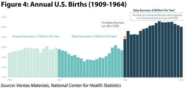 SH meeting attendance and interest was elevated, and, although queries prodded for potential cracks after such a strong year, organic growth remains robust as aging baby boomers drive record demand (Figure 4). For acquisitions, competition from private competitors has increased, but we are also seeing more assets coming to market (thanks to more stable interest rates) and the REITs’ first mover advantage continues to pay dividends. Despite 2025’s record setting year, we believe 2026’s transaction volume could increase further (the REITs should remain outsized beneficiaries).